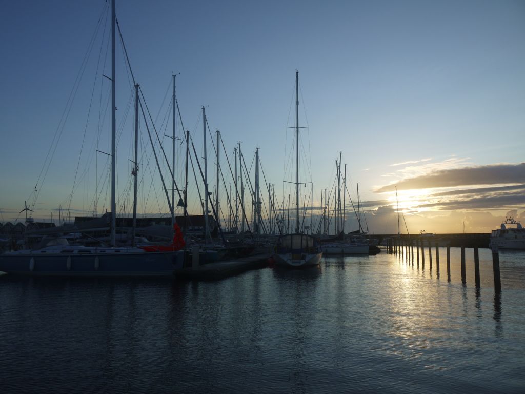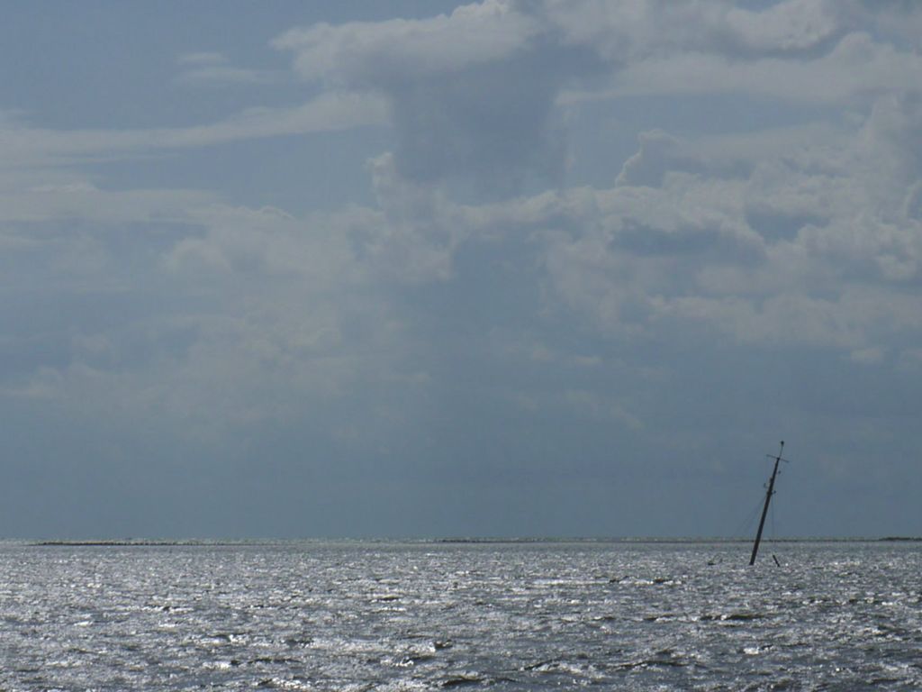 Bei Aalborg noch die letzte Brücke passiert, dann den Limfjord bis zur Ostsee entlang gschlängelt. Fast Flußartig geht die Fahrt dahin. Mit Wind aus Südwest musste ich alle Tricks und Kniffe anwenden um hart am Wind noch jeden Meter Höhe rauszuholen, um dann nach einer Kurve wieder gemütlich mit achterlichem Wind zu entspannen. Bei der Ausfahrt in die Ostsee sind vorgelagerte Sandbänke zu beachten. Starke Strömungen und der Südwestewind bewirken hohe Wellen, gegen die anzukämpfen ist. Es geht gerade so unter Segelen. Ein kleiner Winddreher, und ich würde nicht mehr dem 50 Meter breitem Fahrwasser folgen können. Ich lasse sicherheitshalber den Motor mitlaufen. Im vorbeifahren sehe ich ein Wrack, von dem nur der Mast aus dem Wasser ragt. Das ist wohl in den Stürmen der letzten Tage aufgelaufen.