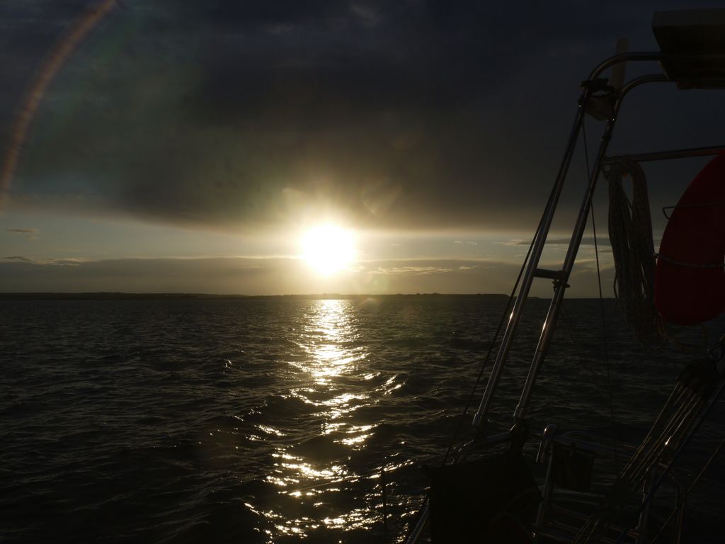 Nachts habe ich mich maximal für 10 Minuten ausgeruht, dann war wieder ein Wende, ein Ausweichmanöver oder eine Kurs und Segelkorrektur gefordert. In den engen Fahrwassern mit viel Verkehr und großen Frachtern war immer Aufmerksamkeit gefordert. Und es ist alles flach. Das Land bietet kaum Windschutz, über den Untiefen bildet sich schnell eine Grundsee (hohe und steile Wellen).