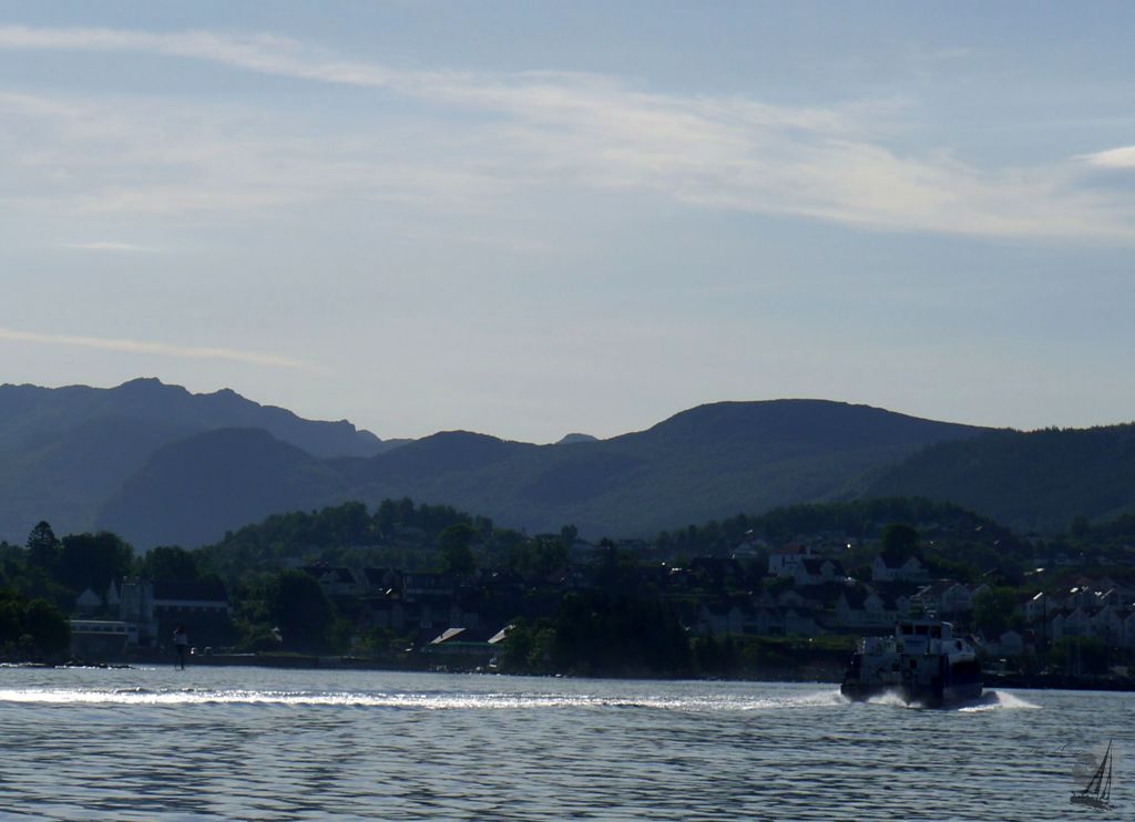 Jetzt, 4 Stunden später, geht es entlang der Insel Boemlo in Richtung Bergen. 15 Knoten Wind aus SüdWest und Sonnenschein.