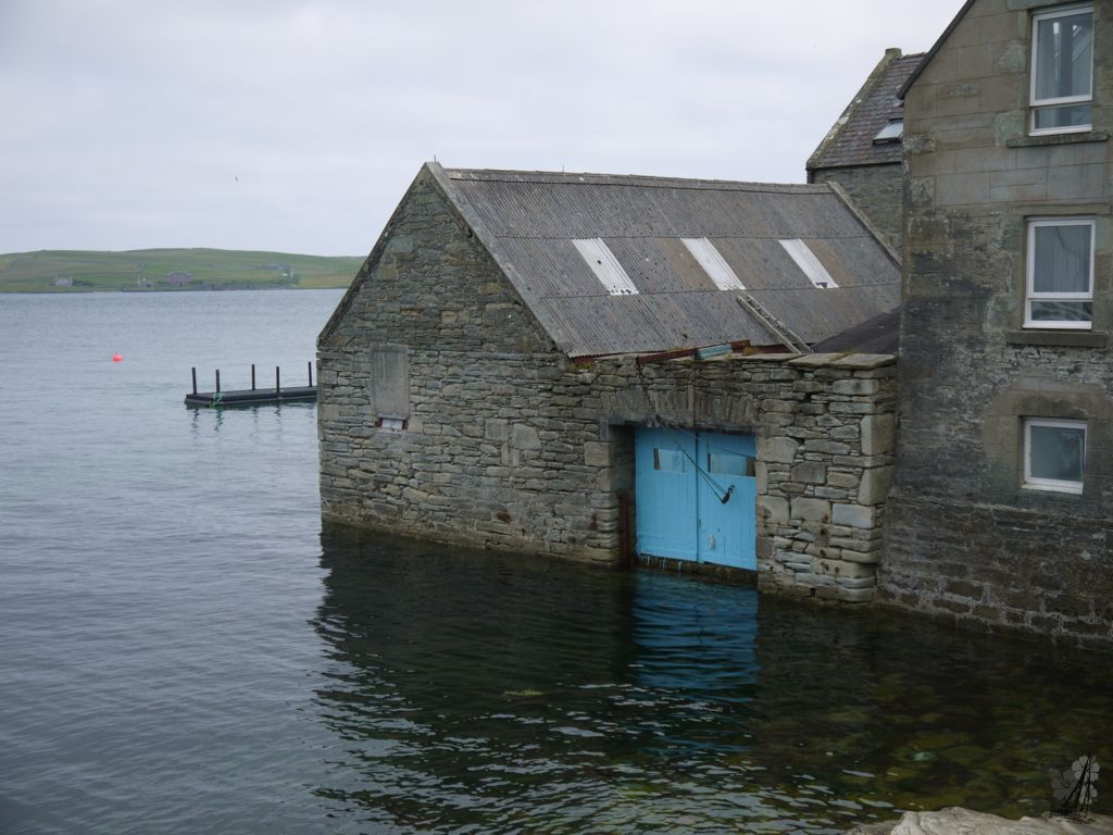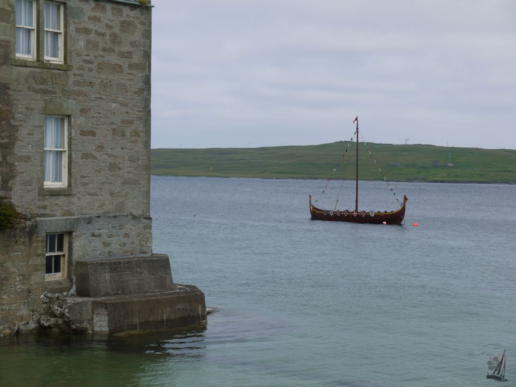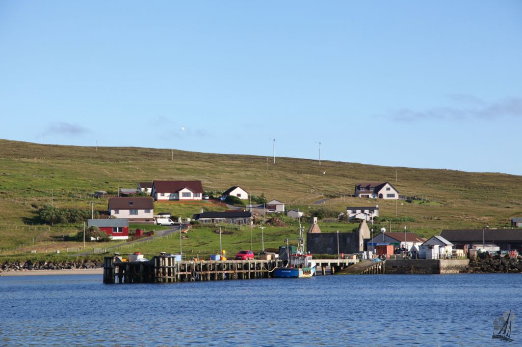 Ich habe wieder den Nautical Almanac rausgeholt, wir sind wieder in Gezeitenzonen. Es ist gerade Vollmond. Das ergibt ausgeprägte Gezeiten (also besonders niedriges Niedrigwasser und hohes Hochwasser), die sogenannte “Spring Tide”. Zur Spring Tide sind die meisten Häfen für die Fleur bei Niedrigwasser leider zu flach. Ankern ist angesagt. In MidYell klappt das wunderbar. Der Anker hält wie fest betoniert, selbst bei den zackigen Böen rührt sich nix. In Vidlin, wo ich in den Hafen wollte der sich aber wie gesagt als zu flach erwies, hatte ich wohl 3 mal den Anker geworfen um nur ein Bündel Seegras zu ernten, aber keinen Halt zu finden. Nach ungefähr 10 mal in der Bucht kreisen, um eine sandige Stelle in 3 m Tiefe zu finden, hat dann der Anker auch gehalten. Alles nicht so einfach wenn man alleine ist. Stelle finden, merken, im weitem Bogen gegen den Wind hin fahren, aufstoppen, an den Bug eilen, warten bis das Boot langsam zurück driftet, Anker raus lassen und die sandige 2 qm große Stelle treffen, 20 m Kette raus lassen, nach hinten, Boot in den Wind ausrichten, mit Rückwärtsfahrt den Anker eingraben, wieder vor, 5 m Kette wieder einholen um den Schwojkreis zu reduzieren (die Bucht war klein), Kettenhaken fest machen, nach hinten noch mal Rückwärtsgas und checken ob alles hält, Motor aus, GPS Ankeralarm einschalten. Geschafft. Dann nur noch Boot klar machen, Segel ordentlich auftuchen, etc. Anlegerbier und Abendessen. Und immer das GPS im Auge behalten!