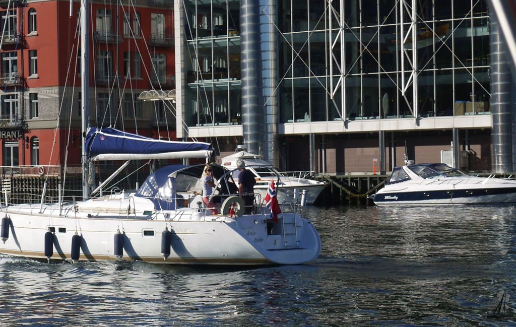Das einzige andere Boot im Hafen ist eine holländische Bavaria 37 “Enivest”. Unglaublicherweise, hat er mich vor eineinhalb Monaten in Vlieland / Holland im Hafen gesehen. Die waren gerade im Nordfjorden und sind wieder auf dem Weg nach Süden.
