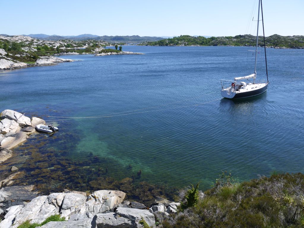 Flaute. Von Bergen also erst mal mit Motor durch die Fjorde bis zum offenen Meer. Dort hat es hoffentlich wieder etwas Wind und es ist Platz zum Kreuzen. Nicht sehr weit, dann kommt schon wieder ein enger Fjord. Der Wind hat auf über 20 Knoten zu genommen und für die Nacht und die nächsten Tage ist noch mehr vorhergesagt. In der Viking Bucht lege ich mich vor Anker. 10 m Tiefe mit Schlammgrund, gut zum ankern. Die Nacht liege ich gut, der Anker hält. Die Bucht ist aber relativ groß und der Wind pfeift ganz schön. Am nächsten Tag, lege ich das Boot mit Buganker und Heckleine an das nördliche Ufer. Ein ganz schöner Aufwand alleine. Mit dem Dingi zum Ufer, eine lange Leine (30m, sind ca. 2-3 Bootslängen) am Felsen fest machen. Am anderen Ende ein Fender. Mit dem Dingi die Leine mit Fender möglichst weit vom Ufer platzieren, der Wind hilft da mit. Zurück zur Fleur. Anker hoch. Rückwärts in Richtung Fender. 3 Bootslängen vorher den Anker fallen lassen (7m Tiefe). Weiter zurück bis zum Fender, dabei Kette geben. Fender aufnehmen und Boot sichern. Alles stramm ziehen und noch eine zweite Leine zum Ufer ausbringen. Eine Stunde Arbeit, aber der Wind weht nun über das Boot und es ist deutlich ruhiger.