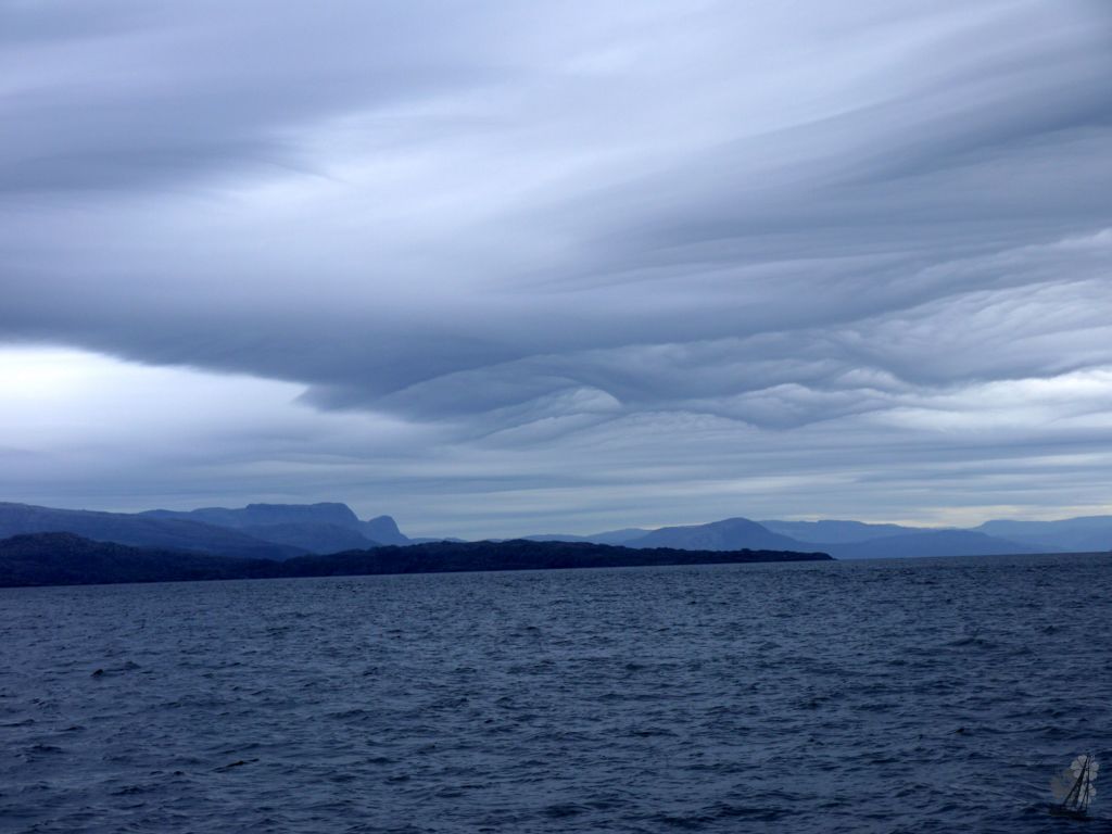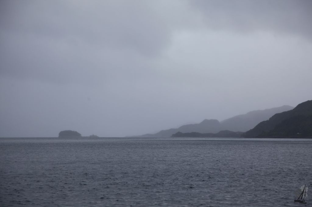 Mit Ziel Måløy (ca. 40nm nach Norden), ist für heute ein komischer Wind vorhergesagt (aber zu mindest trocken bis zum Abend). Die Windströmung eines Hoch über England trifft hier aus West kommend auf das Festland. Ein Teil der Strömung wird nach Norden, der andere nach Süden abgelenkt. In der Mitte ist Flaute. Das ist da, wo ich bin. Also erst mal mit Motor, mal wieder, nach Norden bis ich die nördliche Windströmung erreiche. Die Küste hier ist “verseucht” mit Untiefen. 10 Meilen vom Festland nur Wasser um einen. Der Blick in die Seekarte zeigt aber, dass es um einen viele Stellen mit 0 bis 5m Tiefe hat, dazwischen bis 300-400m tiefe Täler. Wehe dem, der hier unaufmerksam oder unkontrolliert unterwegs ist.
