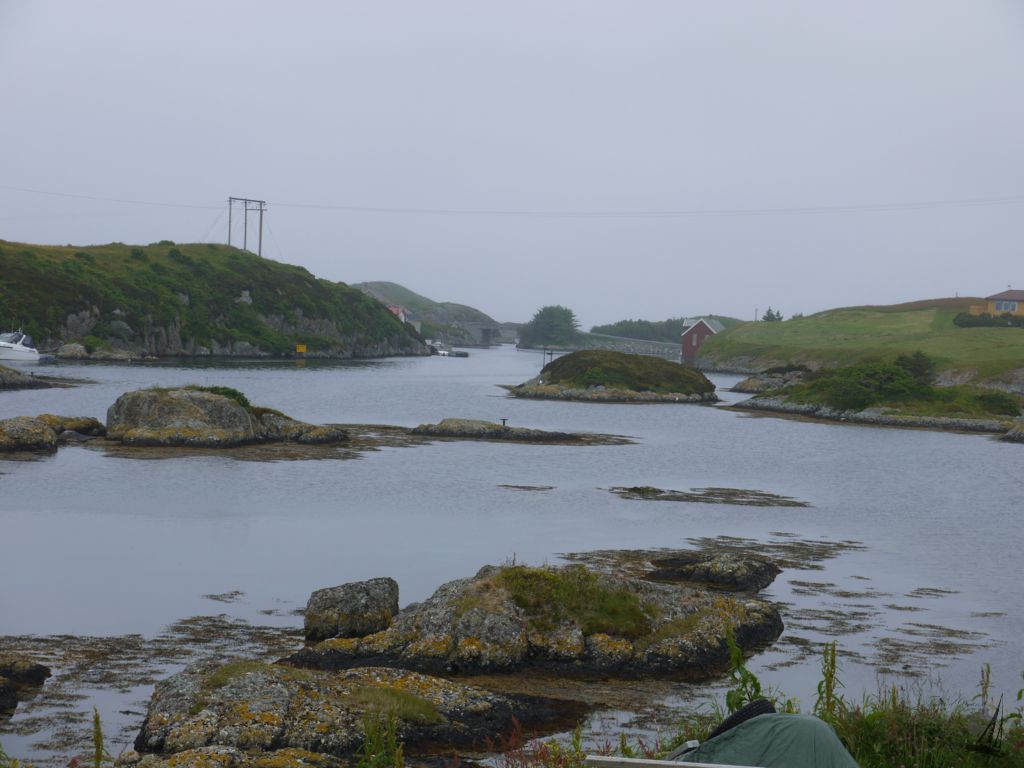 Weiter nach Bulandet, ein kleines Archipel mit vielen kleinen Inselchen. Dazu sind die gefährlichen Seegebiete #15 und #14 zu durchqueren. Die #15 umschiffe ich westlich und weiter durch den Steinsundet. Am Ende des Sundes lässt der Wind nach, bis zur kompletten Flaute. Die letzten 10 Meilen unter Motor durch die #14. Deutlich zu spüren, die Unterwasserströmgen. Wellen bis 2-3m Höhe, obwohl es keinen Windhauch gibt. Die Wassertiefe schwankt zwischen 180m und 7m. Die steilen Unterwasserberge- und täler reflektieren die Wellen, lassen Strömungen in verschiedene Richtungen laufen. Ich lasse die Segel oben, damit es nicht ganz so heftig rollt und schaukelt. In der Ferne ragt der 418m hohe Norske Hesken (Norwegisches Pferd) in den wolkenverhangenen Himmel. 2 Stunden durch die enge Einfahrt an der Insel Hovden vorbei, Untiefenmarkierung auf Steuerbord lassen und an der Gjestebrygge (Pier) des Kiosk-Besitzer Nikooeyna anlegen. Leider zu müde um viel zu unternehmen. Für einen kleinen Spaziergang reicht es dann doch. Blöd, dass natürlich genau am weitesten Punkt der Regen anfängt. Wind dazu. Es ist kühl mit gefühlten 5 Grad. Die Hände werden klamm und können kaum den Regenschirm im Wind halten. Naja, nix neues hier oben im Norden. Gewöhnen tue ich mich da aber nicht dran. Als Belohnung gibt es eine heiße Dusche. Voll auf heiß, bis es schmerzt. Das tut sooooo gut!