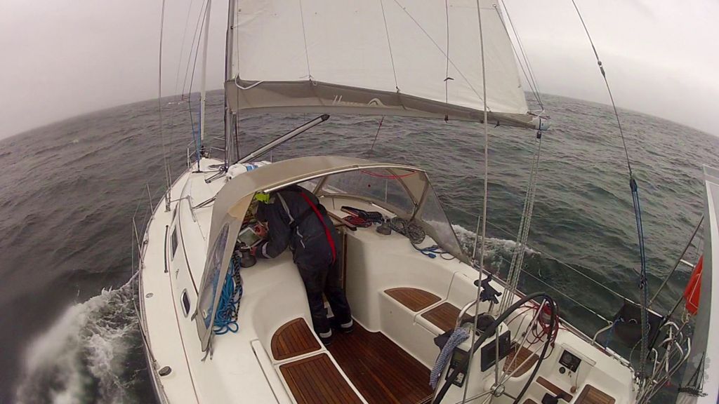 Der Wind hat auf West und dann Süd-West gedreht und kommt mit 10-13 Knoten. Dünung von 2-3 manchmal 4 Metern. Es rollt und schaukelt. Auf und ab. Die Fleur verschwindet fast in den Tälern. Und es hat angefangen zu regnen. Das Land am Horizont verschwindet im Regen. Alles wird grau in grau. Man fühlt sich auf einmal sehr alleine hier draußen.
