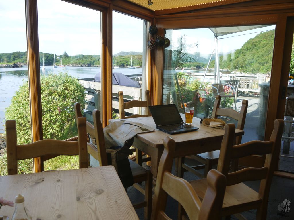Gestern Abend bin ich mit dem Dingi rüber zum Restaurant Badachro gefahren. Vension Burger und ein Pint Bier, auf der Sonnenterasse mit Blick über die Ankerbucht. Erste Klasse. Im Vergleich zu Norwegen ist das wie im Schlaraffenland hier, obwohl England wohl nicht zu kulinarischen, sonnenverwöhnten und billigen Zielen gehört. Aber ein gutes Bier für 4-5 Euro, ein handgemachter Burger mit lokalen Zutaten für 8 Euro, im Supermarkt frisches Gemüse und eine riesige Auswahl, das macht einfach Spass.